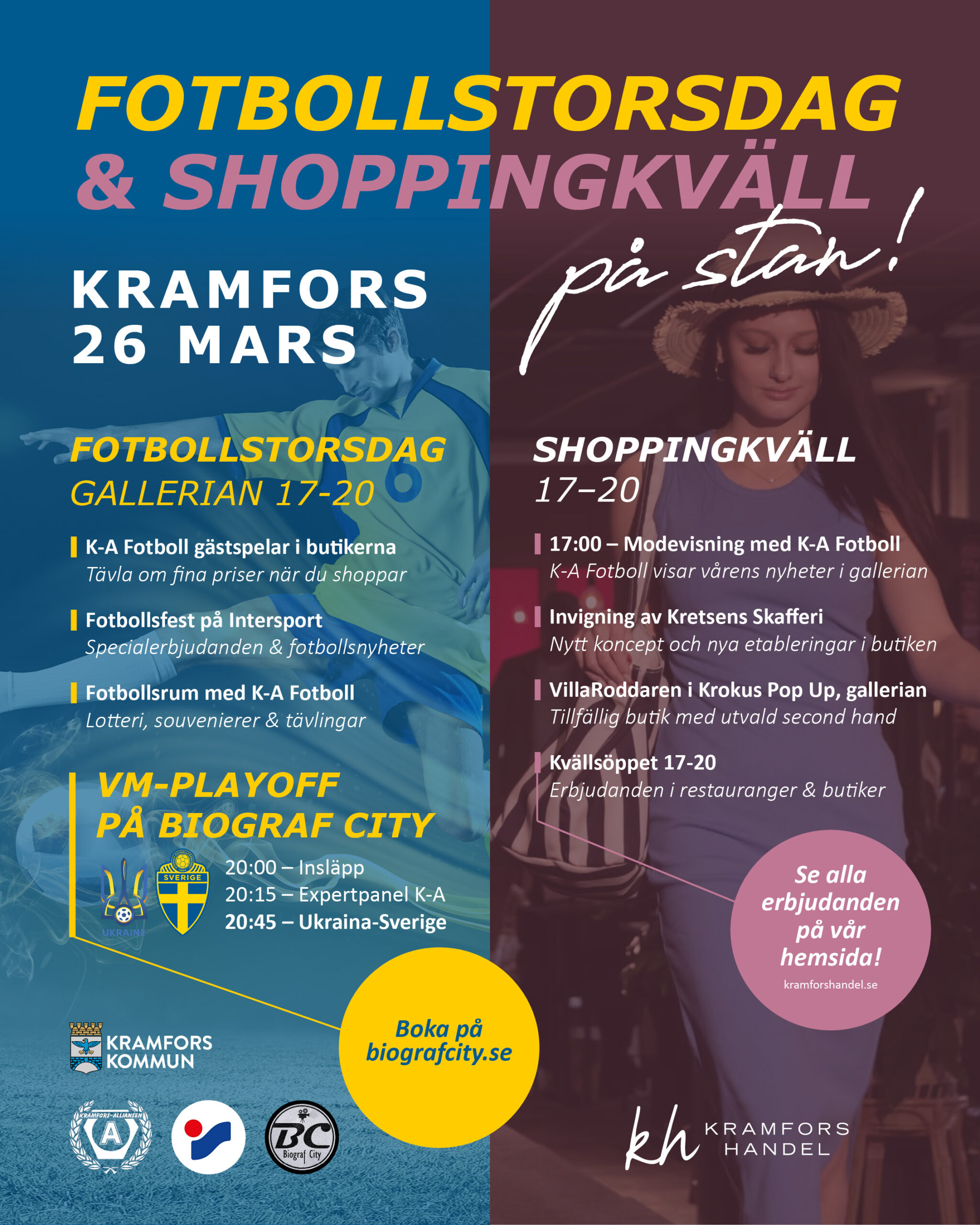 Torsdag den 26 mars bjuder Kramfors Handel in till en shopping & fotbollskväll på stan med kvällsöppna butiker till 20:00. Vi håller öppet och bjuder in till en myskväll på Kiosken.